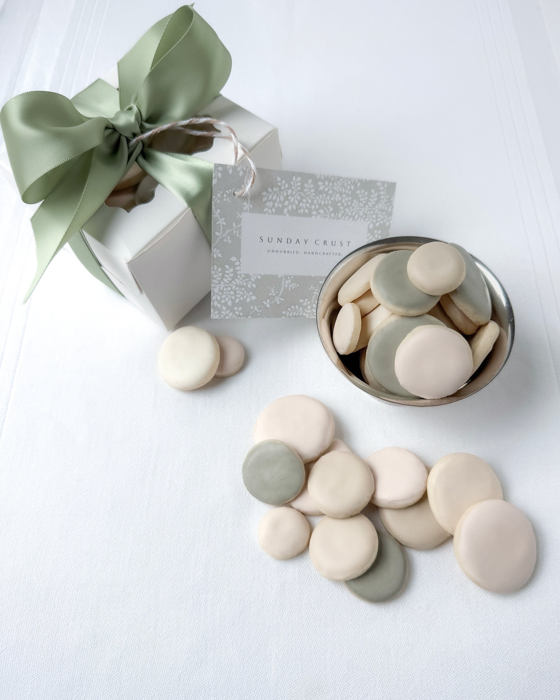 Tastemaker rounds in soft champagne tones, finished by hand in vanilla almond with optional bourbon or brown butter notes. A grown up sugar cookie for gatherings and gifting.